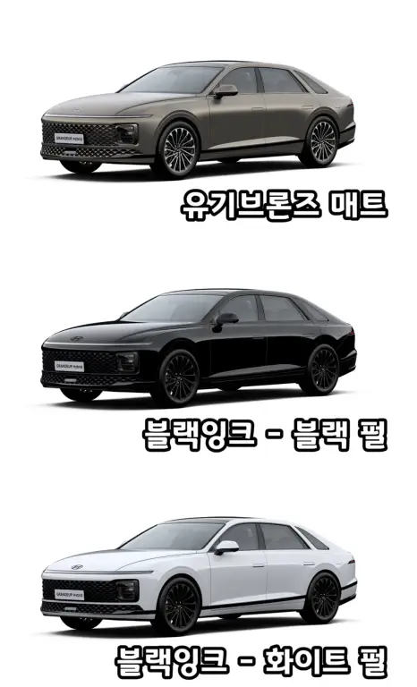 기본적으로 외장색상은 총 8가지의 색상이 있습니다. 거기에 그랜저 하이브리드 캘리그래피 모델만 적용할 수 있는 색상인 유기브론즈매트 1종과 캘리그래피 색상 옵션인 "블랙잉크"까지 포함하면 10가지가 있습니다.
