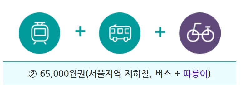 - 이용범위 : 서울지역 지하철, 서울시 면허 시내/마을버스, 따릉이