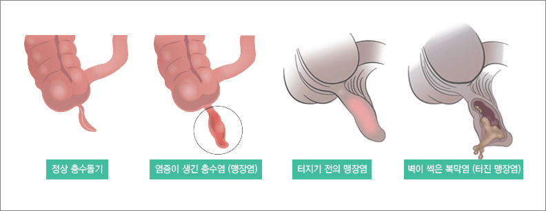 맹장염(충수염)은 충수 입구가 막혀 부어오르고, 혈액순환이 차단되면서 염증이 생기면서 시작되는 병입니다.
