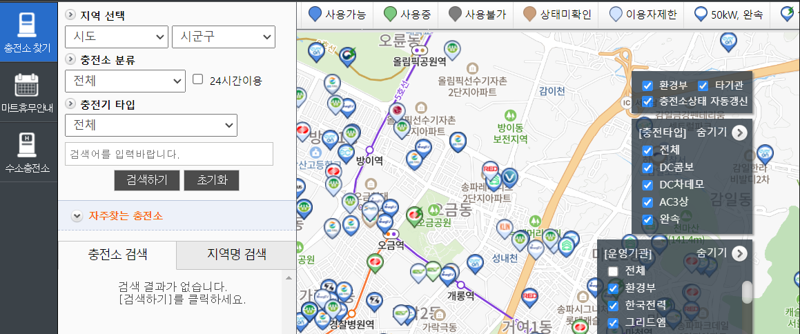 지도에 전기차 충전할 수 있는 곳이 아이콘핀으로 표시되어 있고, 이 아이콘은 운영기관을 의미합니다. 운영기관은 환경부에서부터 현대차까지 매우 많습니다. 오른쪽 운영기관 팝업메뉴에서 역시 필터링 가능합니다.