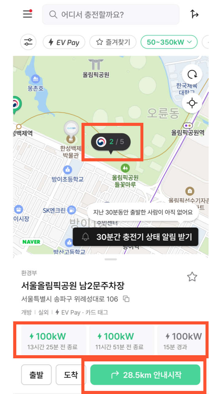 UI가 상당히 깔끔하고 가독성이 좋게 디자인되어 있습니다. 충전소 아이콘을 누르게 되면 충전소 위치 정보와 함께 배치된 충전기 타입/용량정보와 함께 사용되고 있는지, 대기 중인지의 상태를 바로 파악할 수 있게 구성되어 있습니다. 무엇보다 이쁩니다. (개인적으로 이쁘면 성능이 조금 뒤쳐지더라도 더 선호합니다...)