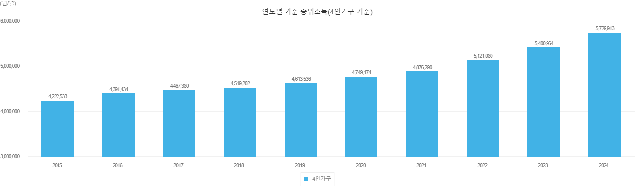 우리나라 가구중위소득의 추이를 살펴보면 아래와 같습니다.