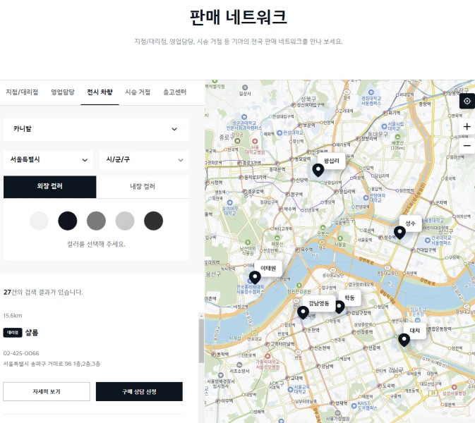 가급적 인터넷, 영상, 사진 등으로 마음에 드는 색상을 2가지 정도 추리신 후에 전시차량을 찾아보시는 것이 가장 좋은 방법 같습니다. 참고로 어떤 차가 어디 대리점에 전시되어 있는지, 2025 카니발 전시 차량이 어디에 있는지는 아래 기아차에서 제공하고 있는 사이트에서 확인할 수 있습니다.